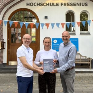 - Pressefoto Übergabe der Urkunde zum Stipendium. V.l.n.r.: Michael Brill (CEO D.LIVE), Lilian Petersen (Projektleiterin D.COLLEGE), Johannes Everke (Geschäftsführer BDKV). Foto-Credit: D.LIVE GmbH & Co. KG