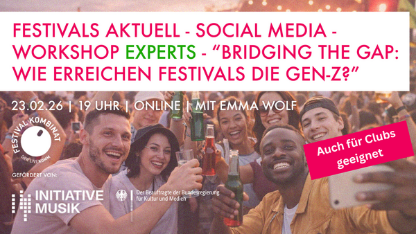 Am Montag, 23. Februar 2026 (19:00–20:45 Uhr), zeigt Expertin Emma Wolf* praxisnah, wie Festival- und Clubveranstalter*innen junge Zielgruppen gezielt ansprechen: von der richtigen Plattformwahl (TikTok, Instagram) über wirksame Content-Formate bis hin zu Community-Aufbau und User-Generated-Content. Im Fokus stehen konkrete Strategien, Best Practices aus der Festivalbranche und direkt anwendbare Tipps.
