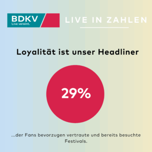 Unser BDKV-Mitglied MGNFY hat in dem Paper „Fan- und Ticket-Marketing bei Festivals und Open Airs in 2025“ ermittelt, dass rund 29 % der Festivalbesucher*innen vertraute Veranstaltungen bevorzugen, also dass sie wiederkommen.