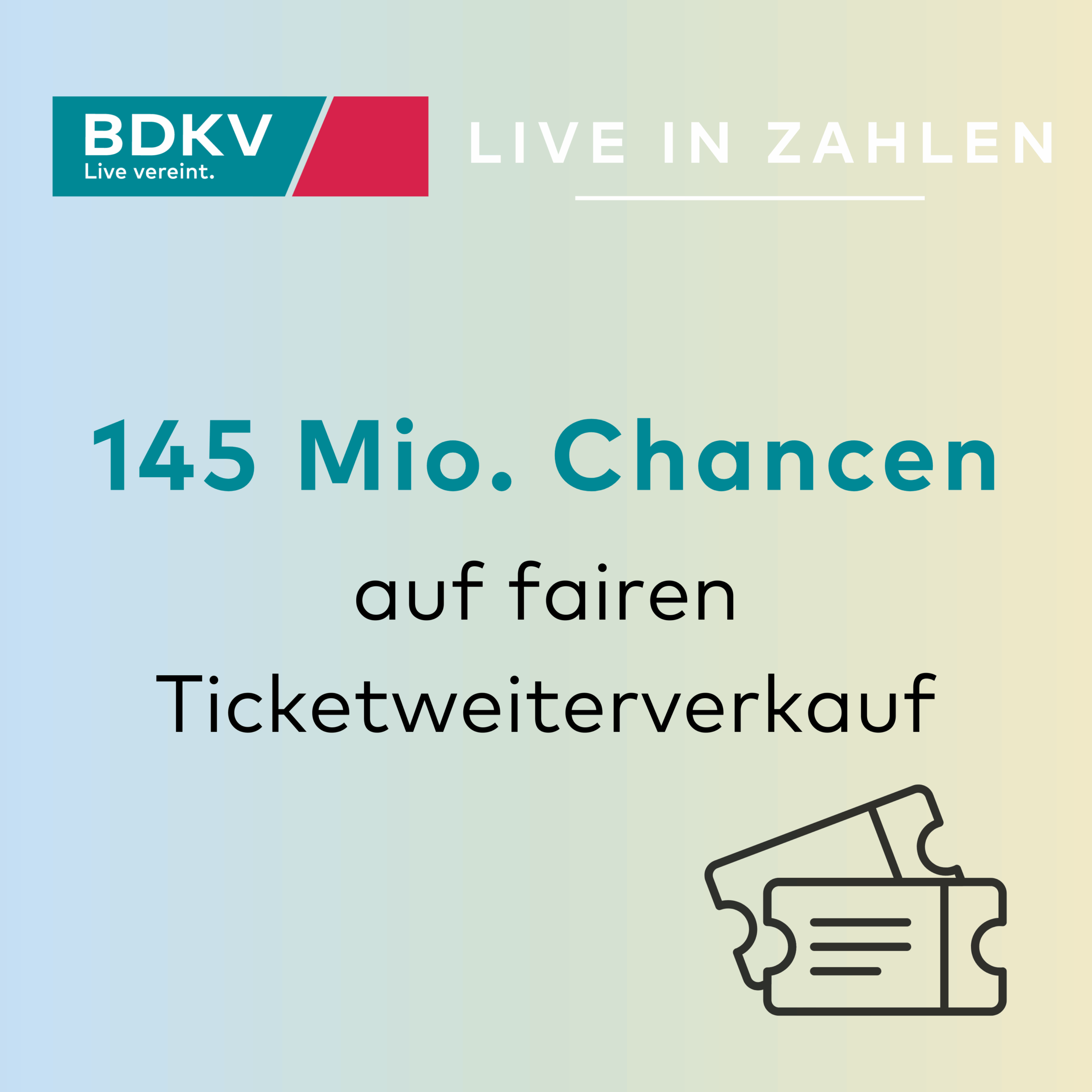 Jedes Jahr kaufen Fans in Deutschland Tickets für Konzerte, Shows und Sportevents. Allein in den Bereichen, die wir in einer Allianz aus Live-Kultur und Sport vertreten, kommen dabei rund 145 Mio. Tickets zusammen: