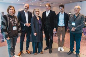 - Bild 2: Die Stimmen auf dem Panel „Polarisierung, Dialogfähigkeit und Kunstfreiheit – der Umgang mit politischen Haltungen auf und vor der Bühne“ gemeinsam mit Präsidentin und Geschäftsführer (v.l.n.r.): Pamela Schobeß (Club Gretchen und Live Musik Kommission e.V.), Johannes Everke, Sonia Simmenauer, Dr. Andreas Görgen (Amtschef BKM), Christopher Annen (AnnenMayKantereit), Klaus Mertes SJ (Jesuit, Autor und Pädagoge).