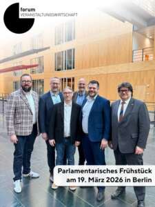 Am Donnerstag, 19. März 2026, folgten insgesamt 21 Parlamentarier*innen demokratischer Parteien der Einladung des Forums Veranstaltungswirtschaft zum Parlamentarischen Frühstück im Bundestag. Johannes Everke, René Tumler (EVVC), Björn Sänger (VDVO), Robert Ninnemann (FAMA), Marcus Pohl und Marc Stähly (ISDV) diskutierten mit den Anwesenden vor Ort aktuell drängende Themen aus der Veranstaltungsbranche.